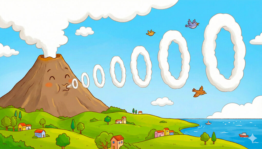 De witte ringen kwamen rustig uit de krater, alsof de Etna diep ademhaalde en daarna voorzichtig uitblies. Het leek net alsof de berg had geoefend met bellenblaas op kamp. Wetenschappers gebruiken daar een supermoeilijk woord voor: ‘vortexringen’. Maar ja, elke nuchtere knoalster ziet natuurlijk meteen wat er écht gebeurt: