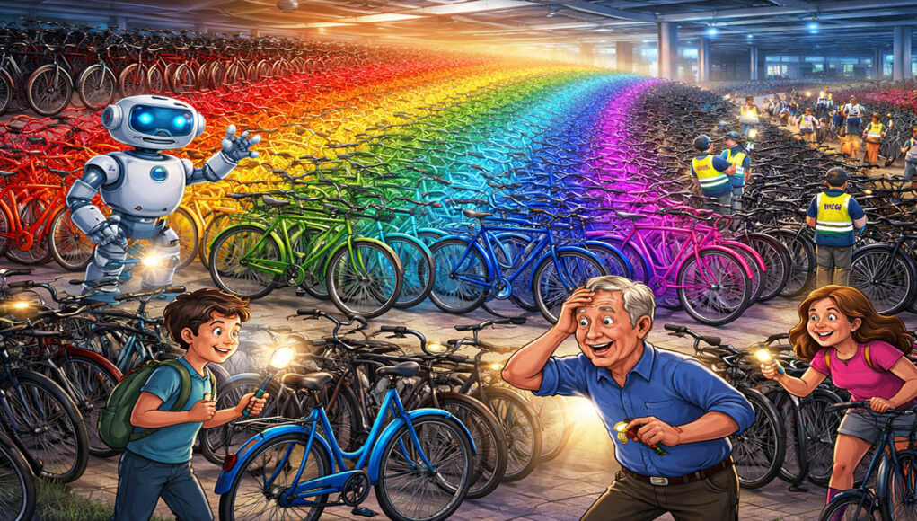 Urenlang was de robot druk bezig. Hij verplaatste fiets na fiets en sorteerde alles keurig op kleur. ๐Ÿšฒโœจ