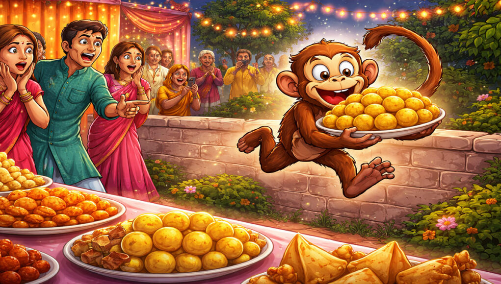 De aap sprong naar voren en greep met zijn harige handjes een heel bord vol zoetigheden 🍡