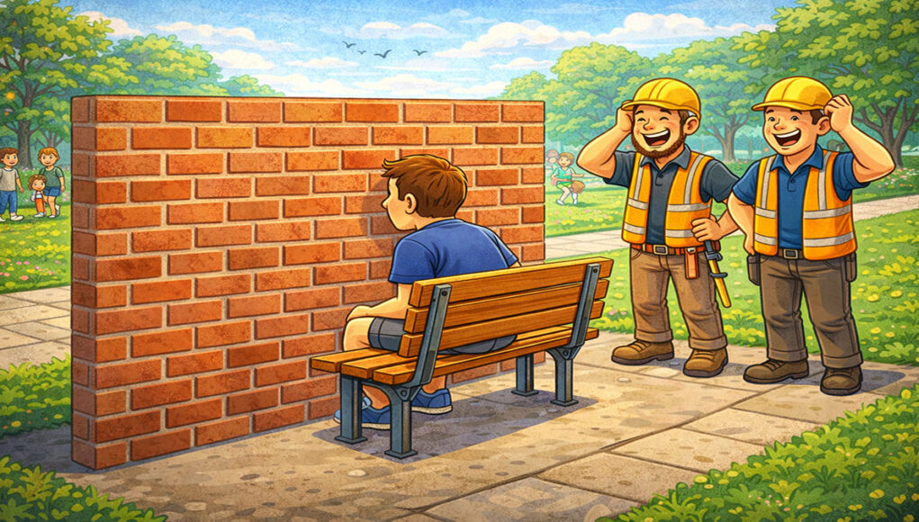 Hopelijk draaien de bouwvakkers het bankje binnenkort alsnog om. Want een bankje in een park hoort natuurlijk uitzicht te hebben op gras, bomen en spelende mensen β niet op een muur.