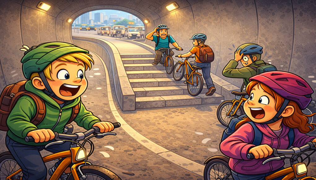 Fietsers die enthousiast vaart maakten in de tunnel, zagen aan het einde geen soepele uitgangโฆ maar vier stevige stenen traptreden! ๐ณ