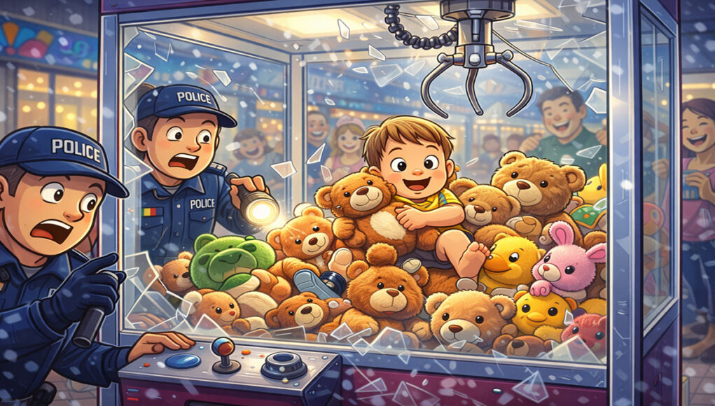 De agenten kwamen snel naar het winkelcentrum en moesten zelfs het glas van de machine voorzichtig kapotslaan om de lachende peuter te bevrijden.