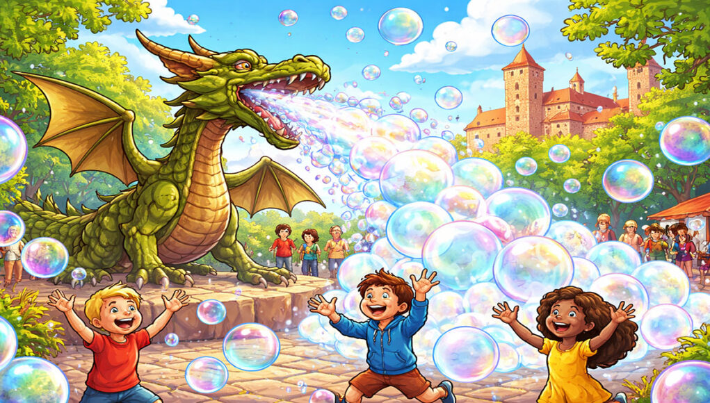 In plaats van vuur kwam er ineens een enorme wolk van duizenden zeepbellen uit de bek van de draak! ๐Ÿซง๐Ÿคง
