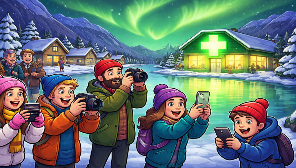Het antwoord bleek een stuk minder magisch, maar wél ontzettend grappig! De toeristen stonden namelijk helemaal niet naar het Noorderlicht te kijken… maar naar een grote, knipperende neonreclame van een apotheek! 🏪