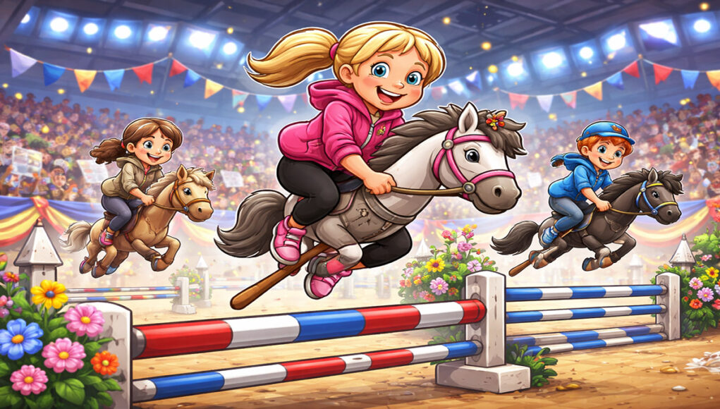 Soms lijkt het bijna alsof de ruiters écht vliegen. Het publiek klapt en juicht alsof er een echte paardenwedstrijd bezig is! 👏