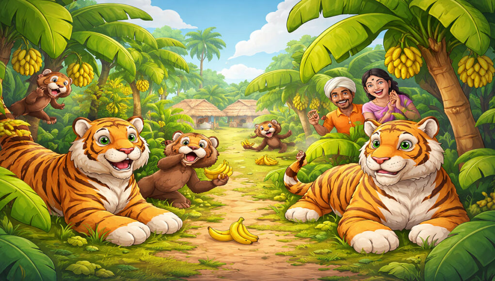 De boer zette de tijgers zorgvuldig tussen zijn bananenbomen, alsof ze echte wachters waren die alles in de gaten hielden.
