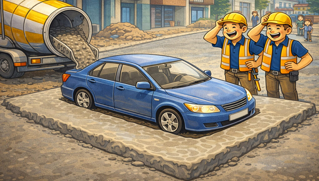 Toen het werk klaar was, lag de hele straat vol strak, nieuw beton… behalve één klein stukje onder de auto.