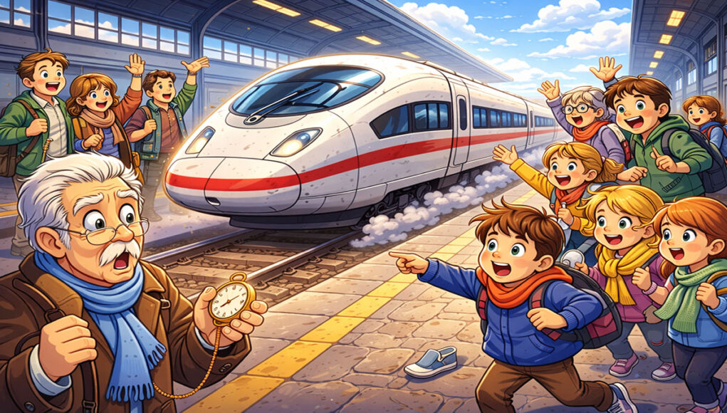 In de grote stad Hamburg stond een supersnelle ICE-trein klaar voor vertrek naar Berlijn. De passagiers keken relaxed op hun horloge en dachten: โMooi, we hebben nog twee minuten. Tijd voor een laatste slokje drinken.โ ๐ฅค