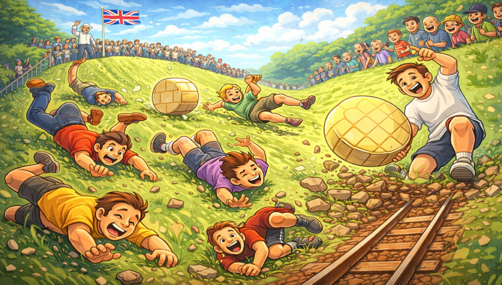Veel sportieve Knoalsters houden van een spannende wedstrijd. Hardlopen, voetballen of mountainbiken 🚴‍♂️. Maar in het Verenigd Koninkrijk hebben ze een traditie die echt anders is: Cheese Rolling.