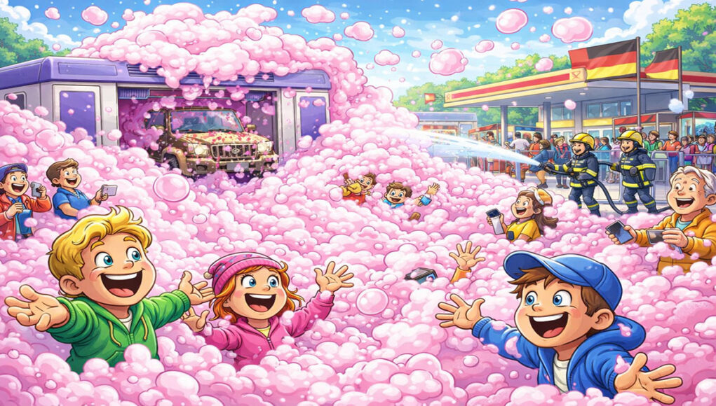 Stel je voor: je rijdt rustig naar de wasstraat om je auto schoon te maken 🚗✨ en een paar minuten later sta je midden in een enorme wolk van knalroze schuim! 😲 Dat klinkt als een grap, maar in Duitsland gebeurde dit echt — en het werd één groot, vrolijk schuimfeest!